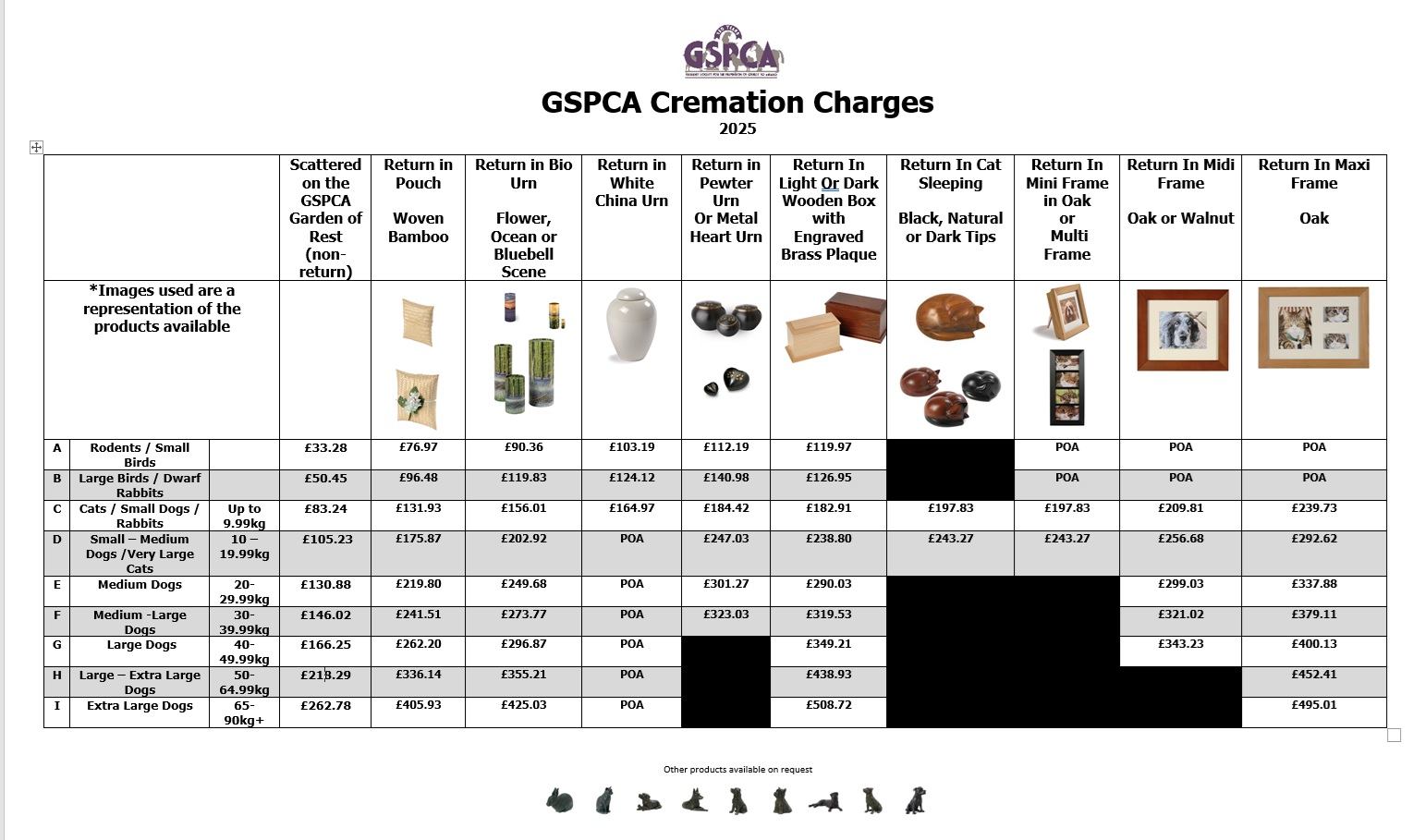 For cremations we can now provide a delivery service of £20.00 if you would like your beloved pets ashes returned without having to come to the GSPCA.